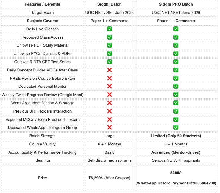 Prepare confidently for UGC NET & SET June 2026 with the Siddhi PRO Batch, a premium mentorship-driven program designed exclusively for serious aspirants. This batch offers a powerful blend of concept-focused teaching, structured preparation, and personalized guidance to help you achieve success in UGC NET Paper 1 and Commerce.